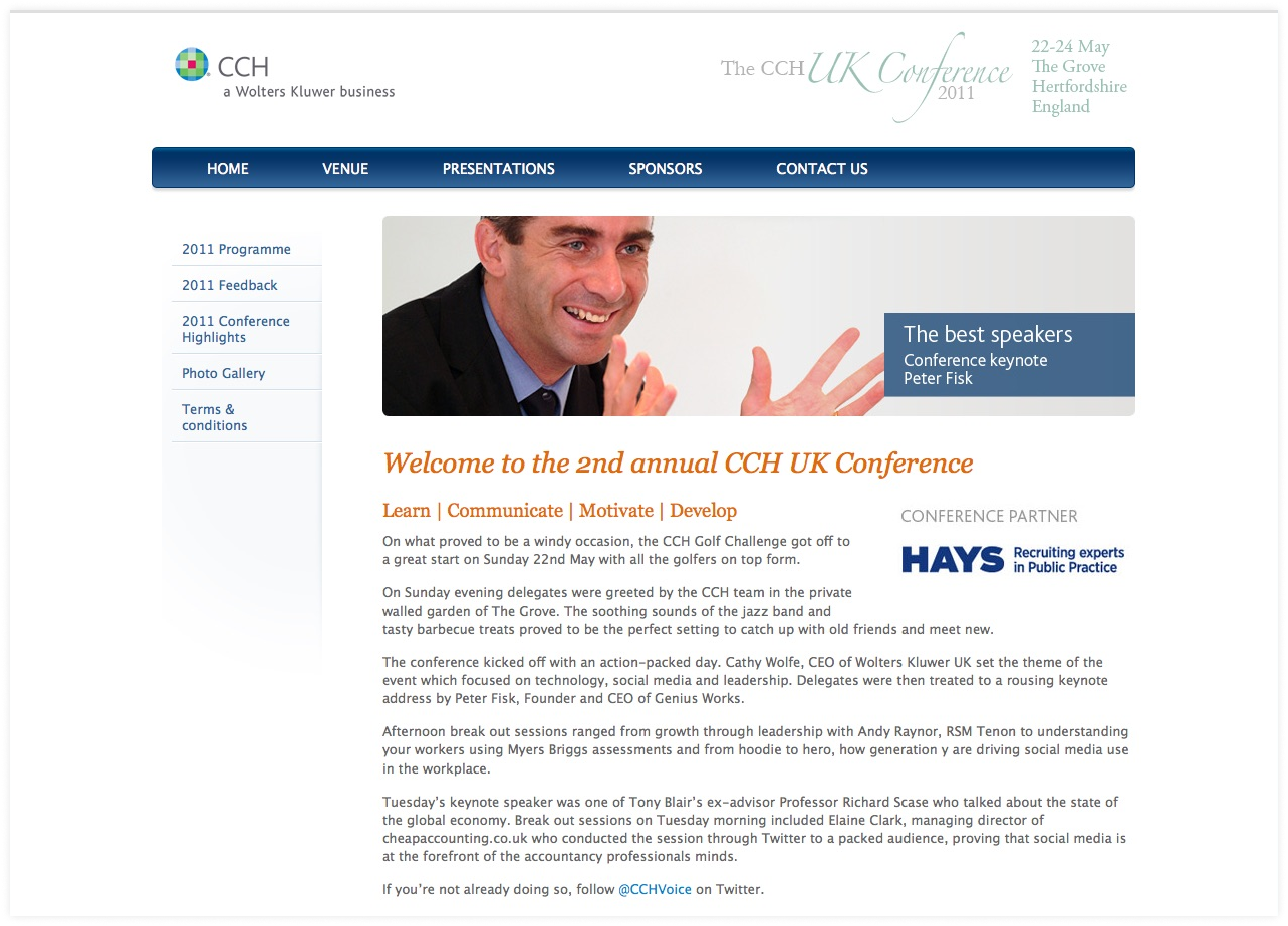 A website for CCH on behalf of Wolters Kluwer to promote The CCH UK Conference, held at The Grove Hotel, Hertforshire. The key aim of the site is to provide details of the Conference and allow registration for next years event. Existing CCH branding was not follwed to allow the design to be unique and identify this as a new event in the UK. Due to fantastic weather and a superb venue the event was an unqualified success.