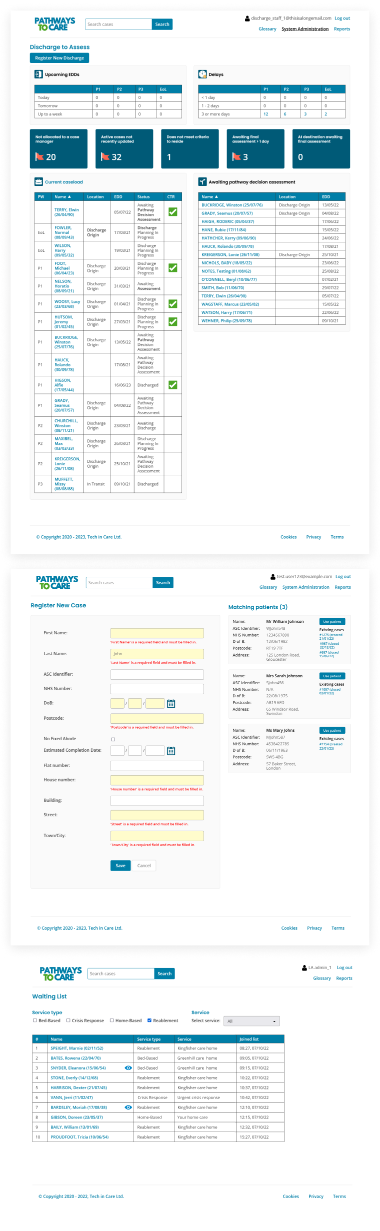 P2C offers case management, tracking and reporting features, allowing users from multiple organisations to create, update and monitor D2A cases across multiple pathways on an open, human driven platform. P2C supports the D2A process from the point at which a person is identified on the ward as requiring support on discharge, through to the point that the person receives an assessment on their longer term needs within a community setting.